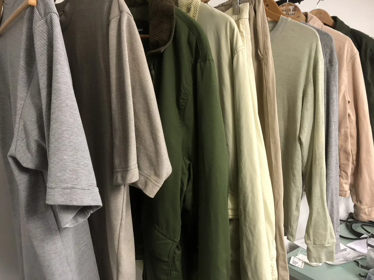 Marjolaine Mansot, la créatrice costume de Paysage de pluie, propose une déclinaison de costumes pour les 4 personnages. La pluie abondante, qui vient transformer les paysages et le quotidien des habitants du territoire, a un impact direct sur les costumes : ceux-ci apparaissent de plus en plus délavés. Elle a donc créé des costumes identiques mais avec des couleurs qui disparaissent lentement.
